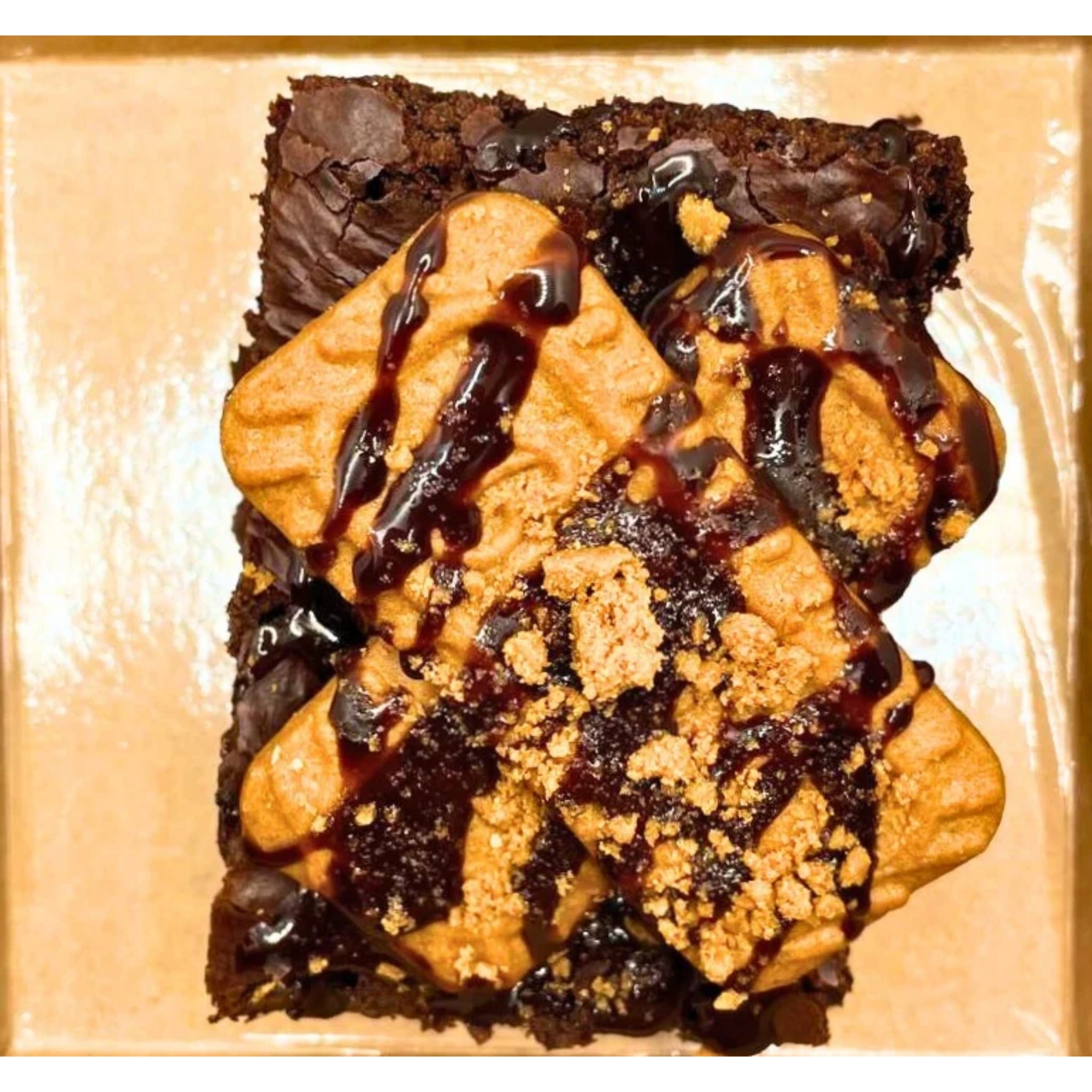 This is a decadent, fudgy chocolate brownie topped with crunchy Biscoff biscuits, drizzled generously with rich chocolate sauce, and sprinkled with a crumble of Biscoff pieces. The mix of soft, gooey brownie and caramelised biscuit crunch makes it look incredibly indulgent and irresistible