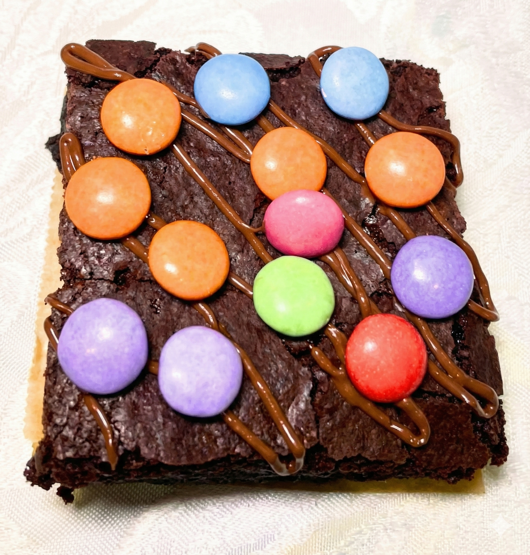 This fudgy chocolate brownie is topped with a drizzle of smooth caramel chocolate and decorated with vibrant Smarties-style candies. The bright pops of colour contrast beautifully with the rich, dark brownie, adding a playful crunch to every bite. A perfect treat for kids and chocolate lovers alike.